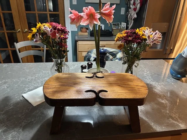 I carried it to the kitchen to take a picture. By that point, I’m not sure if either of them really believed that I had found the actual stool, so I wanted to take a picture in a place that has a built-in time stamp. These kitchen counters are only a year old, so that would narrow down when the photo had been taken. Also, my sister gave me an amaryllis in October, which further shrinks the timeframe.